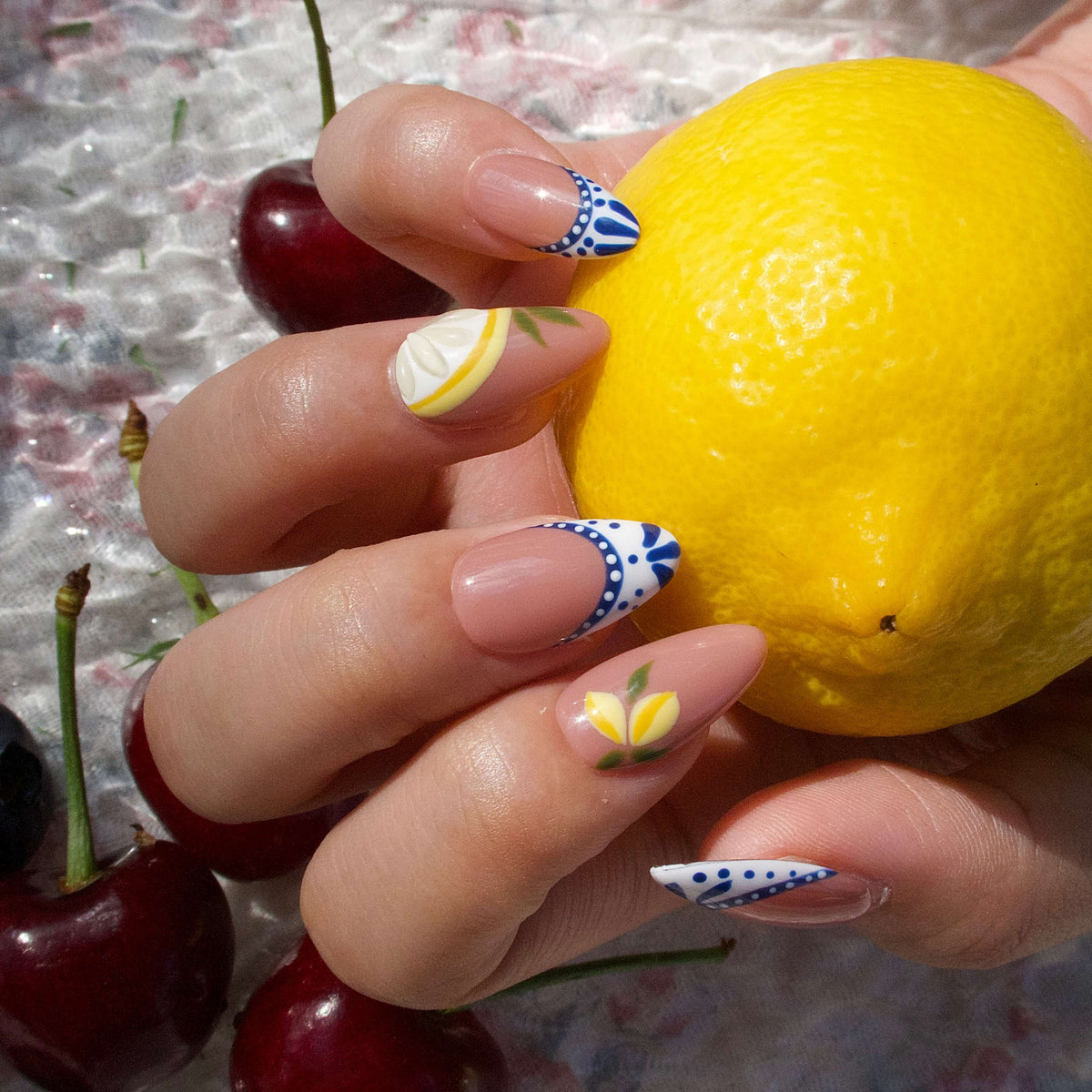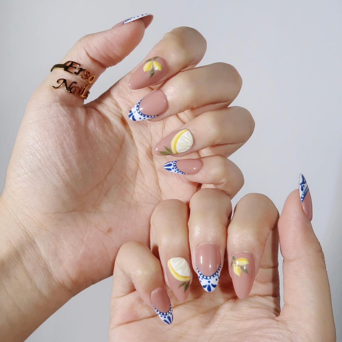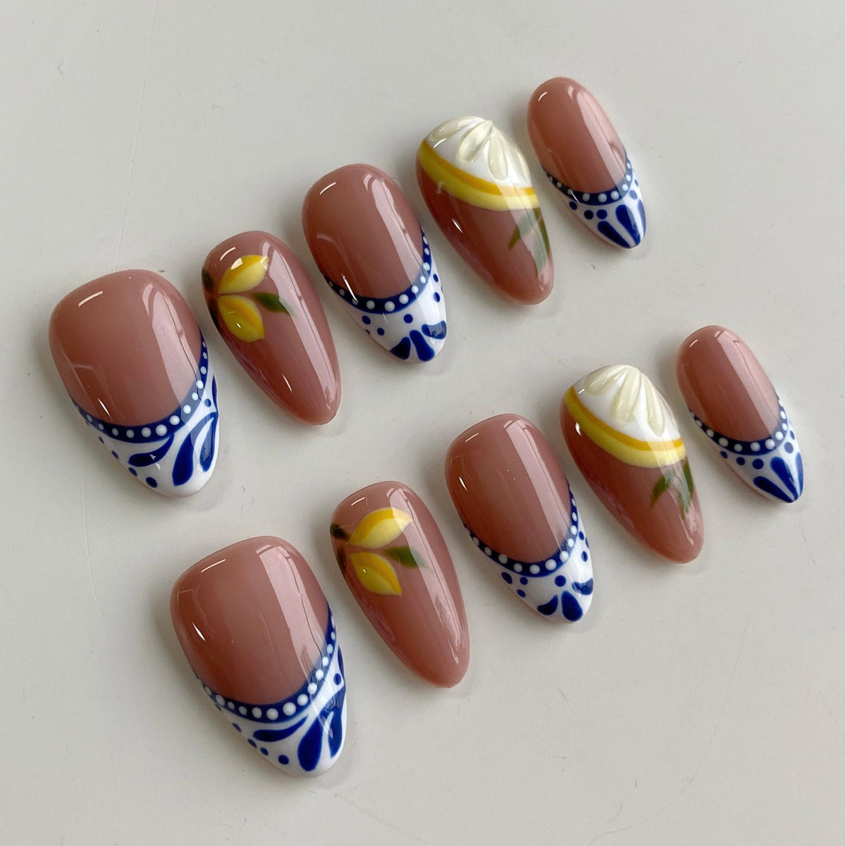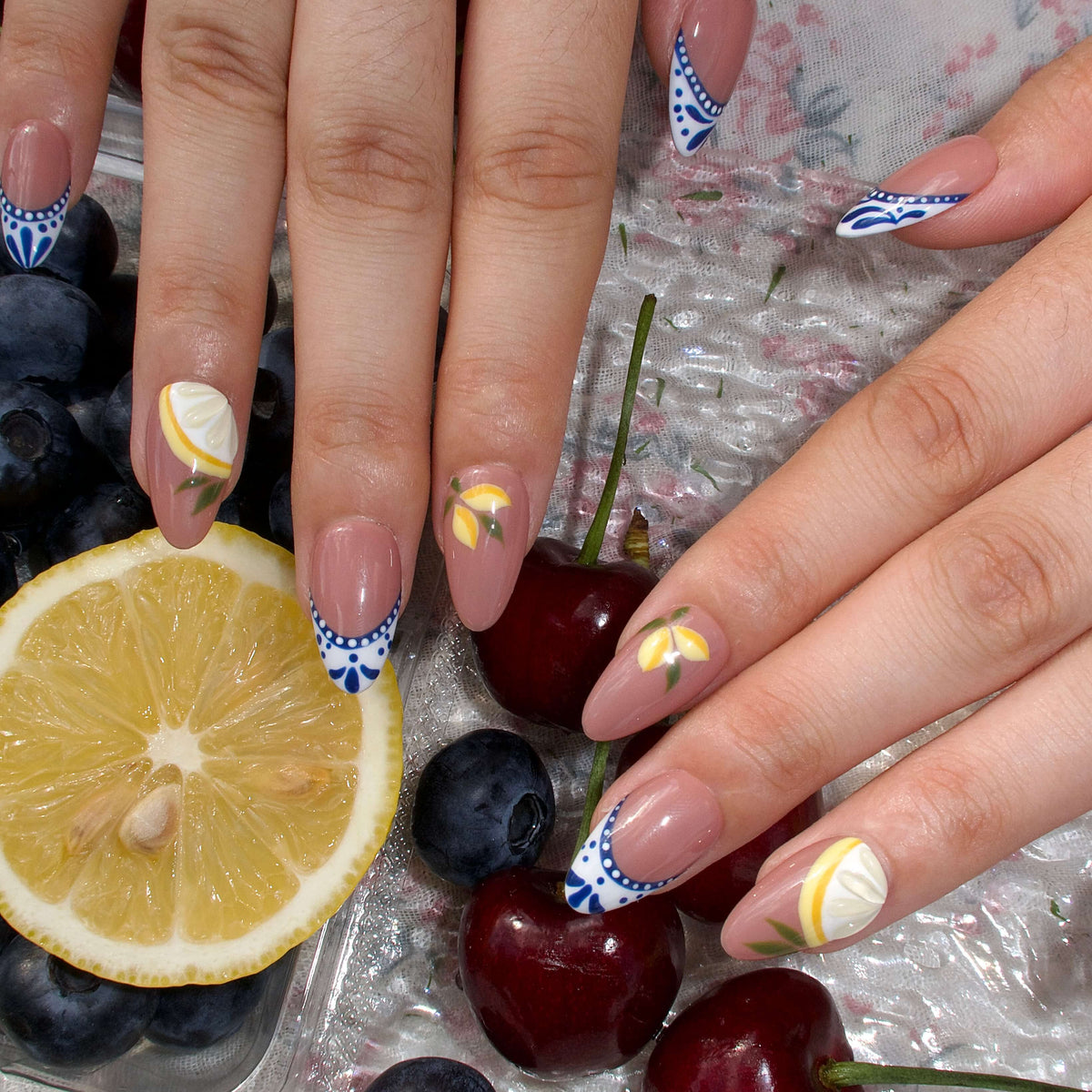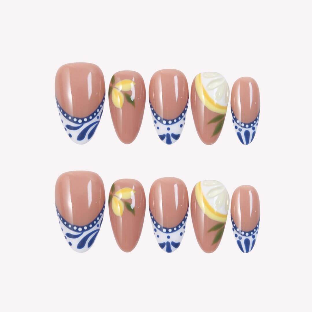 Capture the carefree spirit of sunshine days with Never-ending Summer by hultynail. These nude-based press-on nails feature a refreshing French design accented with playful lemon motifs and Bohemian-inspired patterns. Easy to apply and full of summer charm, this set is your perfect escape to an endless vacation—anytime, anywhere.
