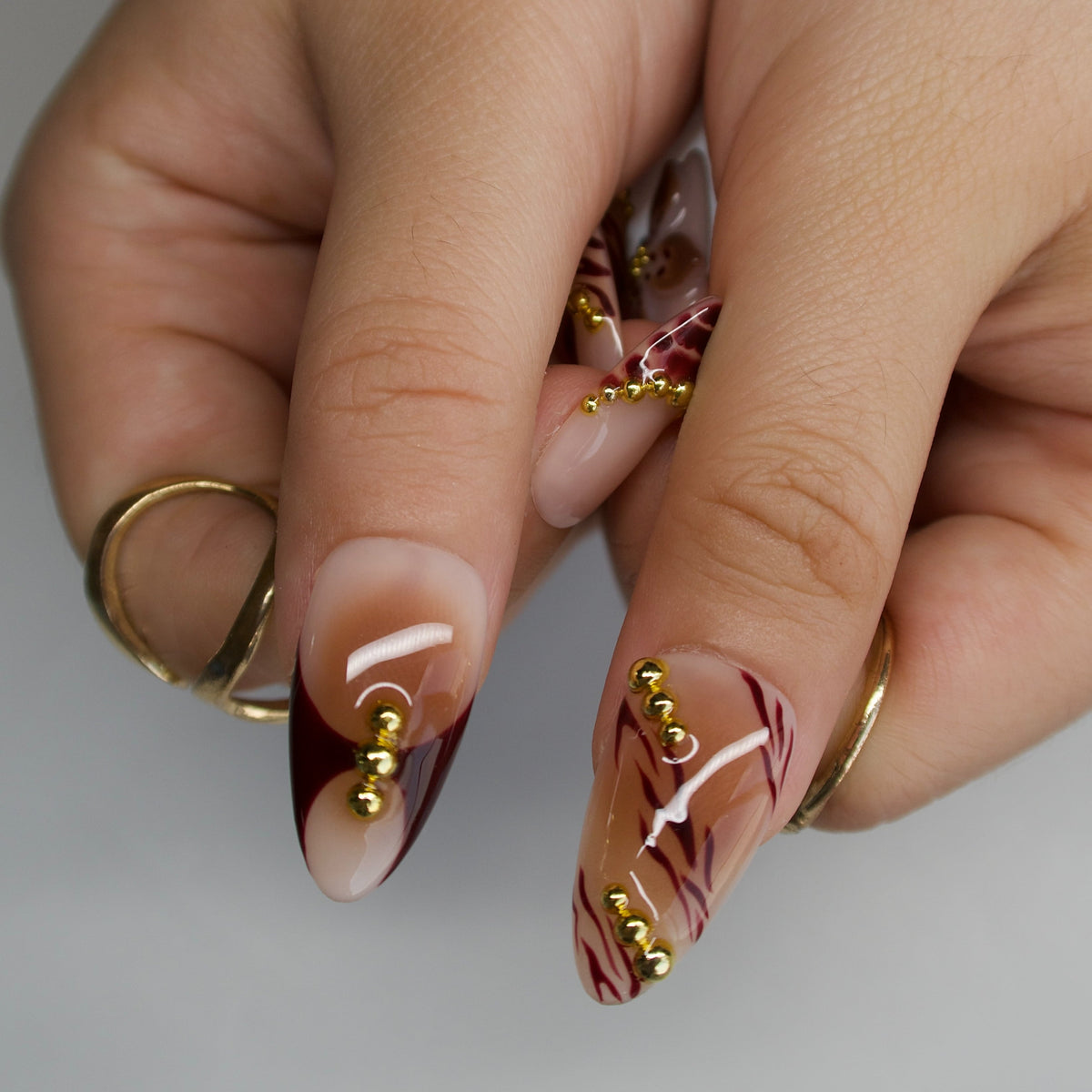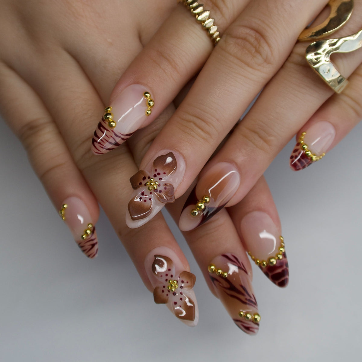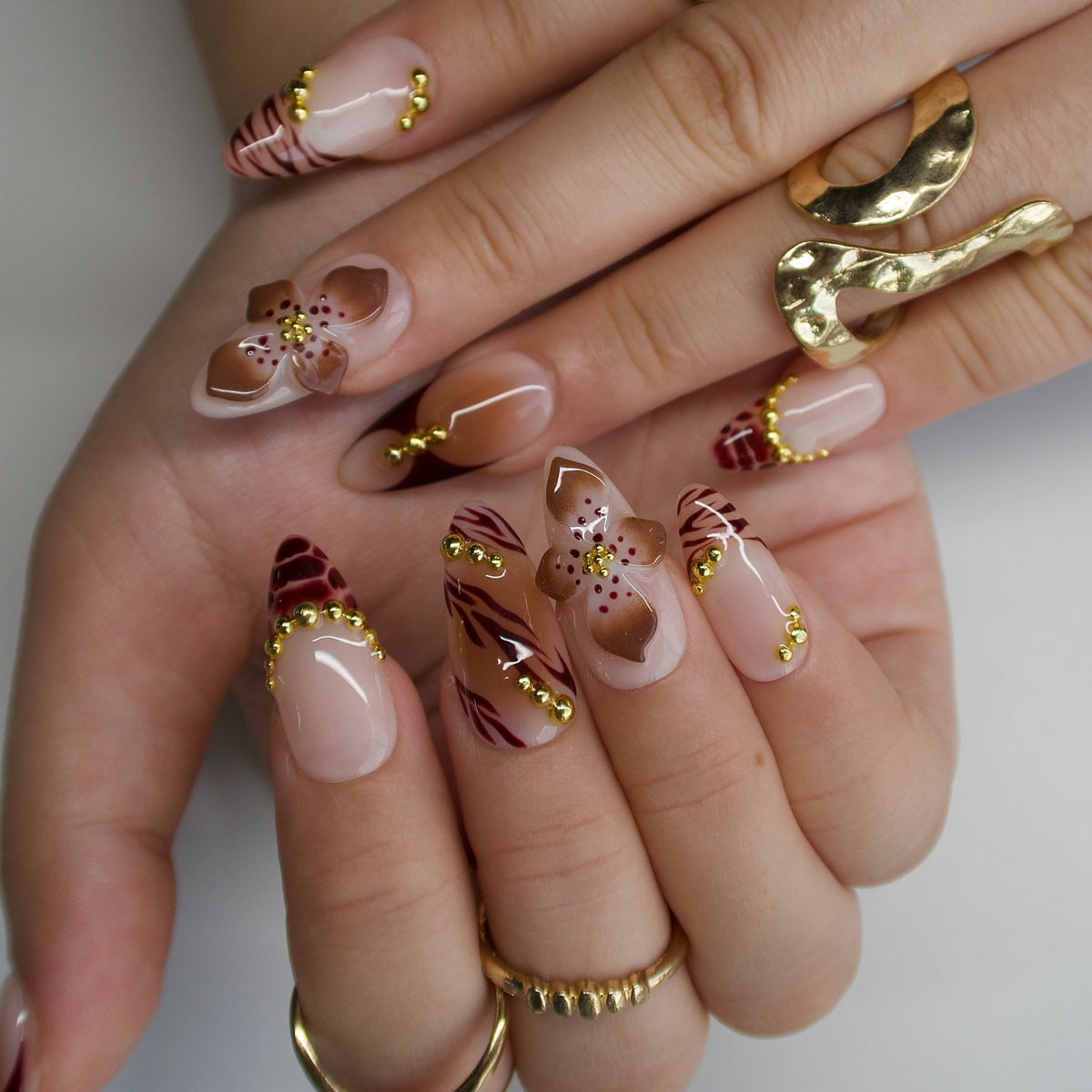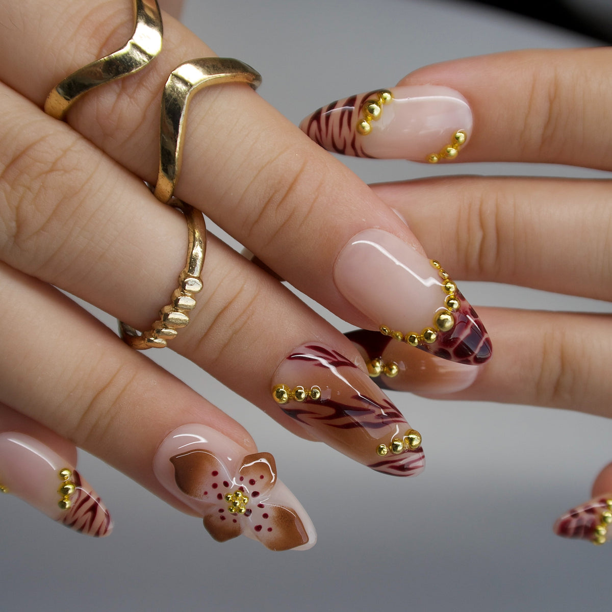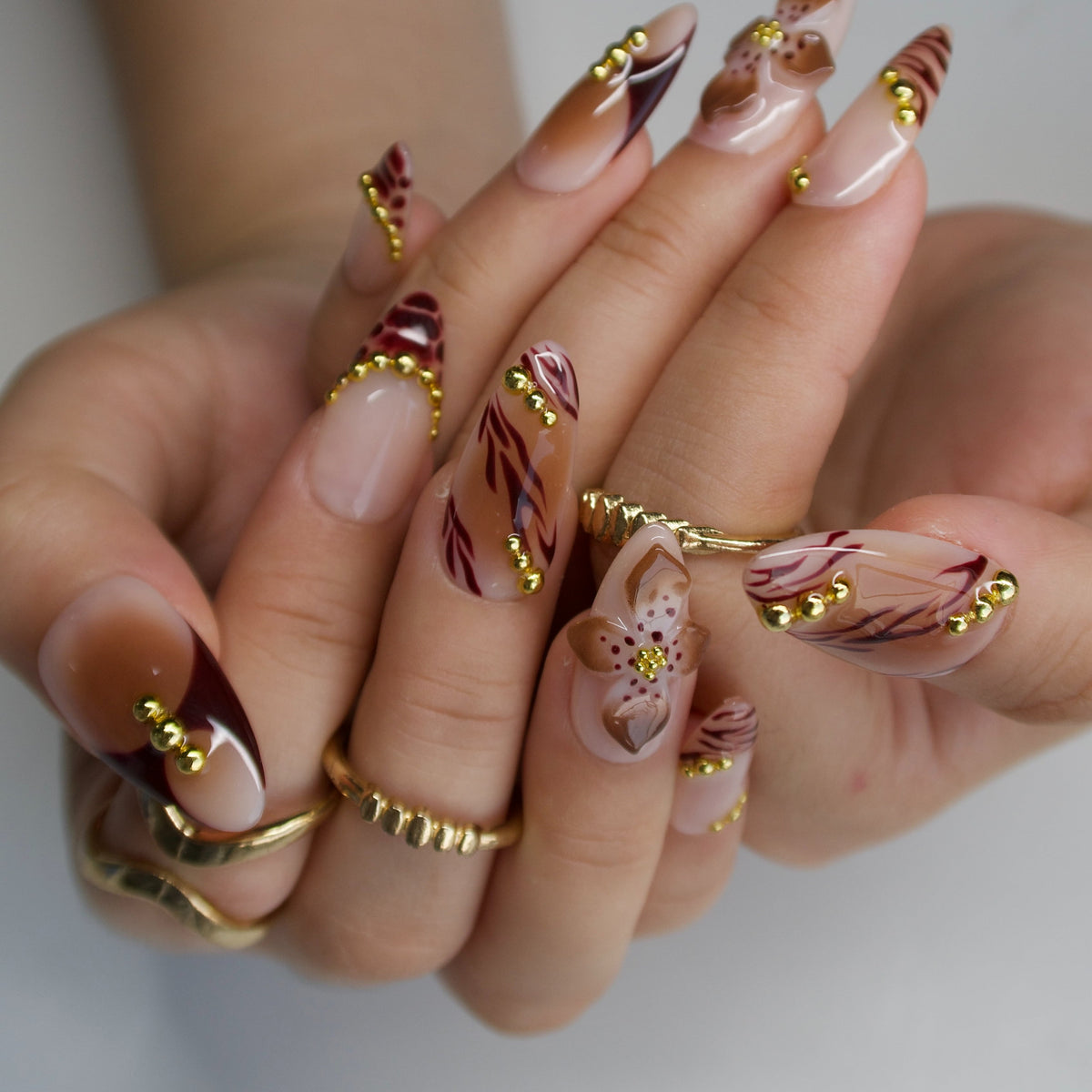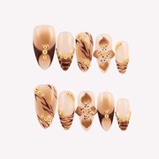 Prologue by hultynail Nails is an enchanting press - on nails set that sets the stage for beauty. With a harmonious blend of soft brown tones, delicate gold accents, and intricate floral patterns, it evokes a sense of gentle anticipation, like the opening chapter of a lovely story. The combination of smooth gradients, dainty details, and elegant designs creates a refined, poetic vibe, perfect for adding a touch of understated charm to daily moments or special beginnings. Subtle yet full of promise, it’s a beautiful choice for those who love narrative - inspired, graceful nail styles.