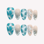 hultynail’ Seafoam press-on nails channel the magic of the ocean with every detail. Featuring a rich blue cat-eye base, wave-like patterns, and an intricate 3D mermaid accent, this design captures the shimmering essence of the sea. A mesmerizing look for anyone drawn to ocean-inspired beauty.