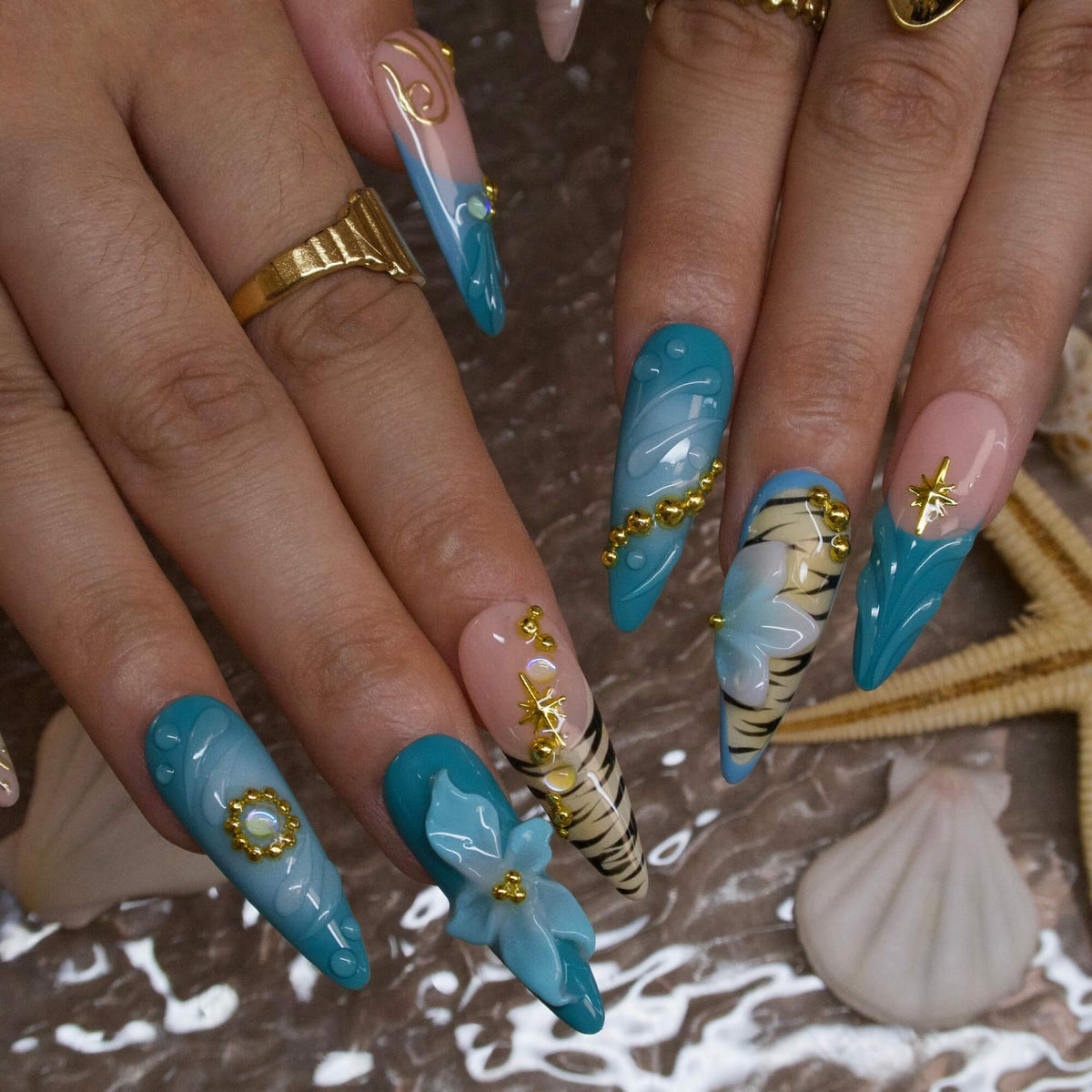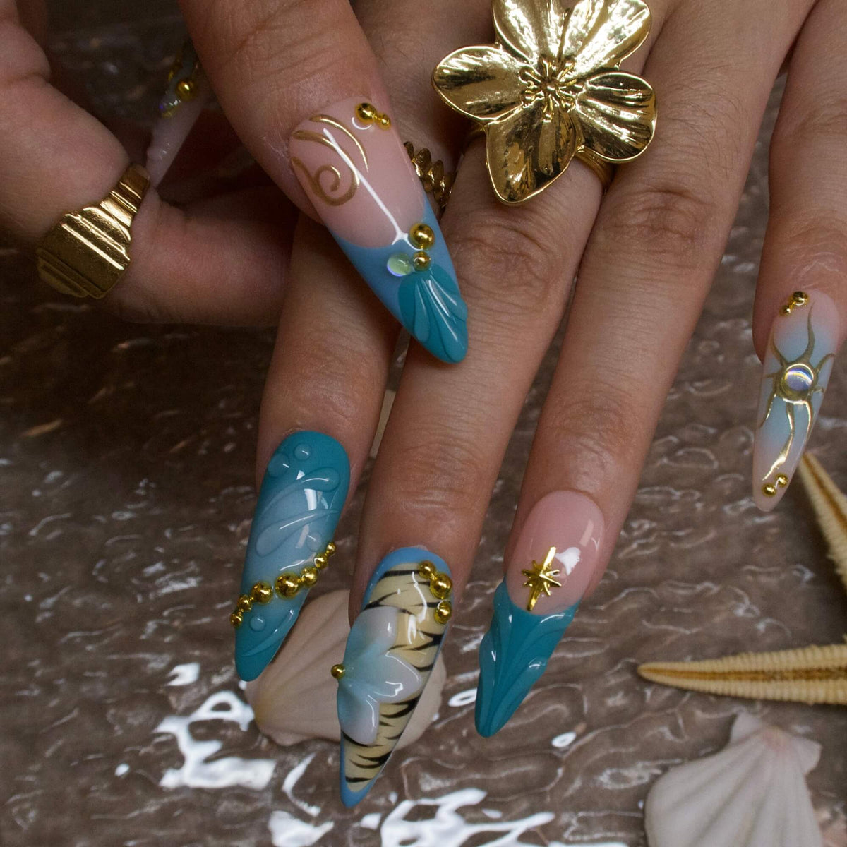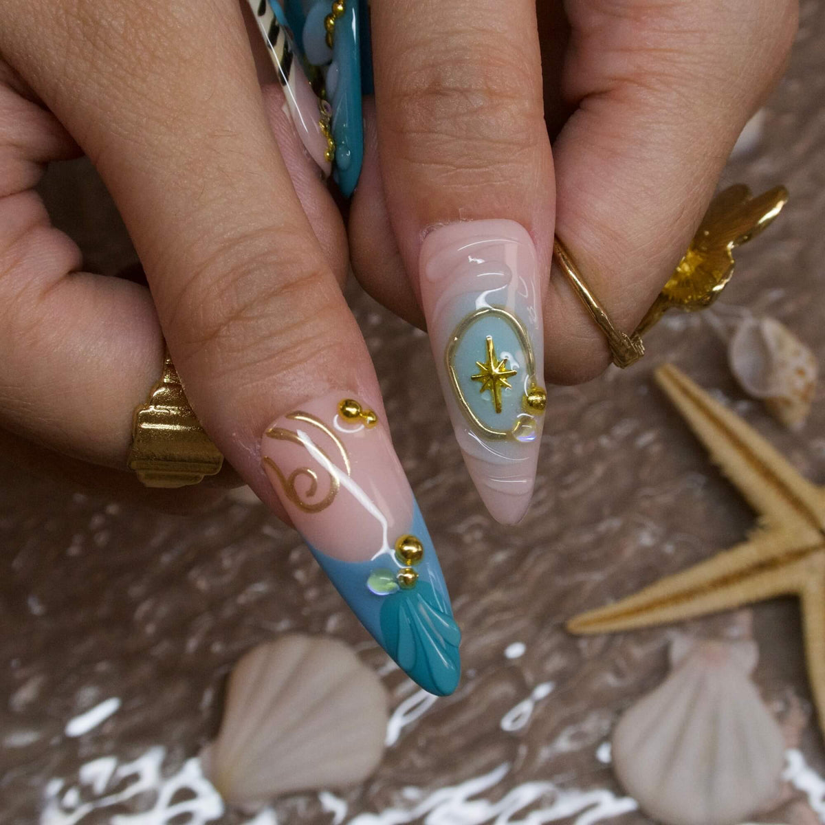 Seaspray by Hultynail takes you on a dreamy ocean journey. On a fresh, mint - green and soft - blue base, 3D ocean - inspired elements like delicate waves and small gold starfish and shells come to life. Gentle gradients of turquoise and sky blue, along with cute star and moon accents, mimic the tranquil allure of a seaside night. Ideal for adding a touch of breezy, marine - filled magic to festival outfits or summer adventures.